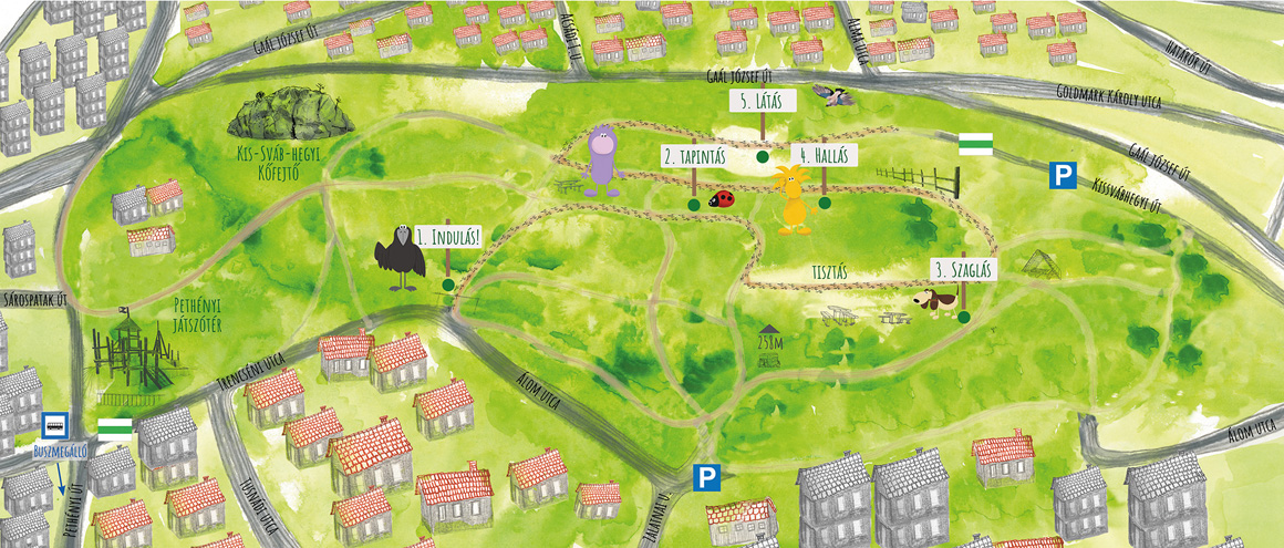 A térkép segítségével járjátok be meseösvényünket, és segítsetek Mimónak és Csipeknek felfedezni a Kis-Sváb-hegy titkait!